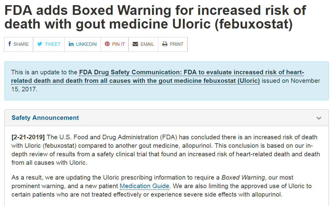 2019年2月21日,美国FDA正式发布针对痛风药物非布司他的警告,在深入回顾一项临床试验后,FDA 发现非布司他易增加与心脏相关的死亡风险。