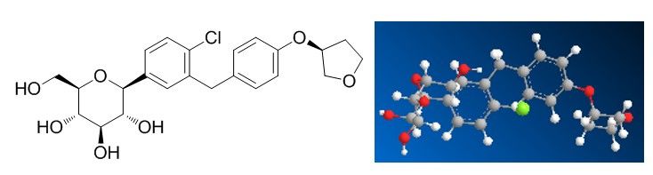 恩格列净最初由勃林格殷格翰研发,后期和礼来联合开发,于2014年5月22日首先获得欧洲药物管理局(EMA)批准上市,2014年8月1日获得美国FDA批准上市,2014年12月26日获日本药品与医疗器械管理局(PMDA)批准上市,2017年9月21日获CFDA批准在中国上市,商品名为Jardiance?。其结构式和3D模型如下: