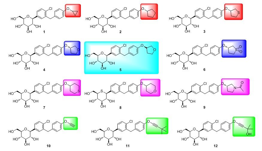 部分优化分子如图3所示,又合成相对少量的分子进行活性测试,最终发现化合物5,即恩格列净的发现。