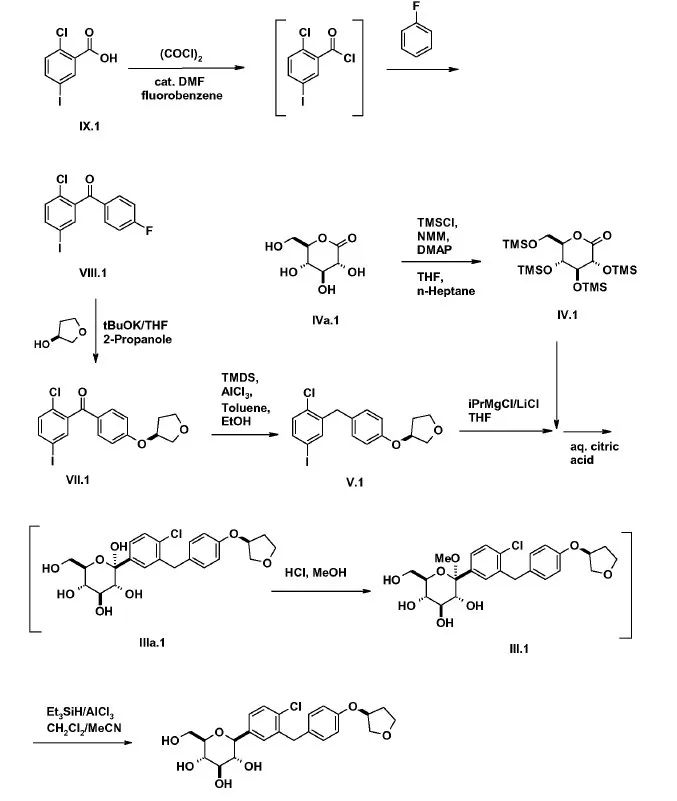 合成路线二(图5),以2-氯-5碘苯甲酸为起始原料,经过酰氯化、付克酰基化,取代,还原等步骤合成了恩格列净。