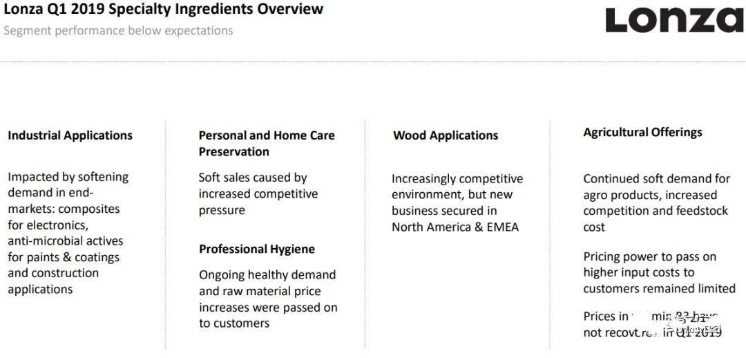 日前,全球最大的CDMO企业瑞士Lonza在2019年第一季度信息披露中表示:公司的特种化学品业务(Specialty Ingredients)告急。