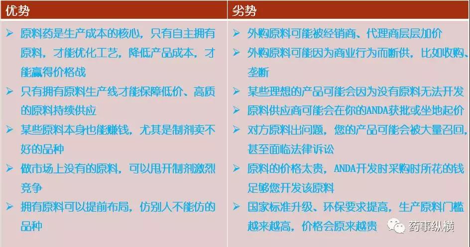 仿制药离不开价格战,而原料药是生产成本的核心,质优价廉的原料药,可以让企业在竞争中保持不败的地位。只有拥有原料的厂家才能够保证原料低价、高质地持续供应,也才能通过不断优化原料工艺来降低生产成本或提高原料的质量。相反,没有原料的厂家,不但原料的供应方面得不到保障,很多商业行为还可能受到约束。很多时候,原料就如同风筝上的线,而控线的人就是原料生产企业,它不但会限制你飞行的高度,还有可能是“成也萧何败萧何”。