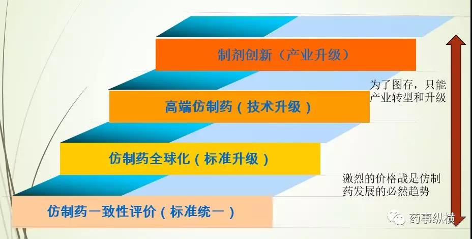 为了甩开竞争,我们必须要进行产业链升级。优化生产工艺和改良生产设备可以节约生产成本,在价格战中获得优势地位,但这只是量变,是局部的。要想完全甩开竞争对手,我们必须做到标准升级、技术升级和产业升级。简单而言,一致性评价可视为一个统一标准的过程,让大家的仿制药产品具有对等性,而仿制药全球化可视为一个标准的升级过程,将中国的标准升级到世界标准,让全世界认可中国的仿制药。尽管如此,标准统一和标准升级尚不足以让一个企业脱颖而出,因为以后仿制药的利润会因价格战而降得很低,要想高利润,我们必须要技术升级,做高端仿制药,比如缓控释制剂,靶向制剂、吸入制剂等等。随着技术的升级,我们需要建立完善技术平台和生产线,能够自主设计和开发创新制剂,最终形成企业的特色,这就是所谓的产业升级。