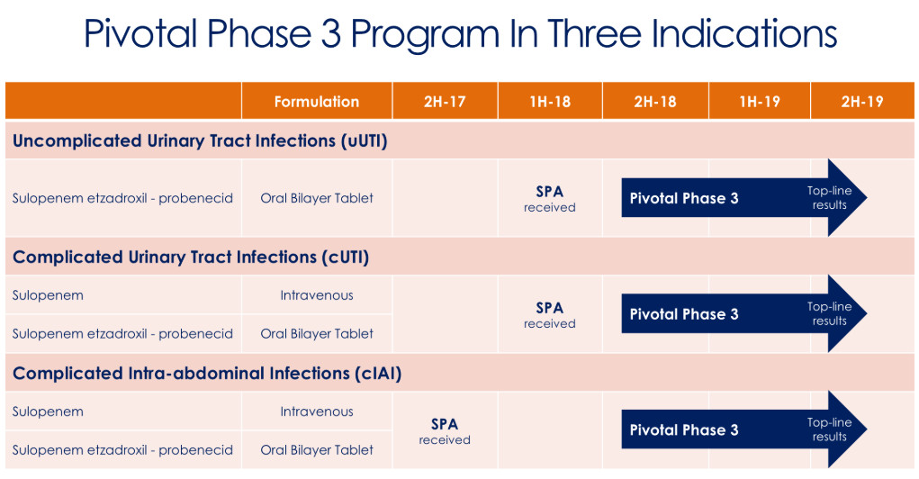 “这些新的FDA资格认定进一步证明了sulopenem的临床潜力,并且为它的开发提供了更多支持。Sulopenem针对多种抗生素耐药性病原体已经表现出强劲的体外活性,”Iterum公司首席科学官Michael Dunne博士说:“我们将专注于完成治疗uUTI,cUTI,和cIAI的3期临床研究,预期在今年年底之前向FDA递交新药申请。”