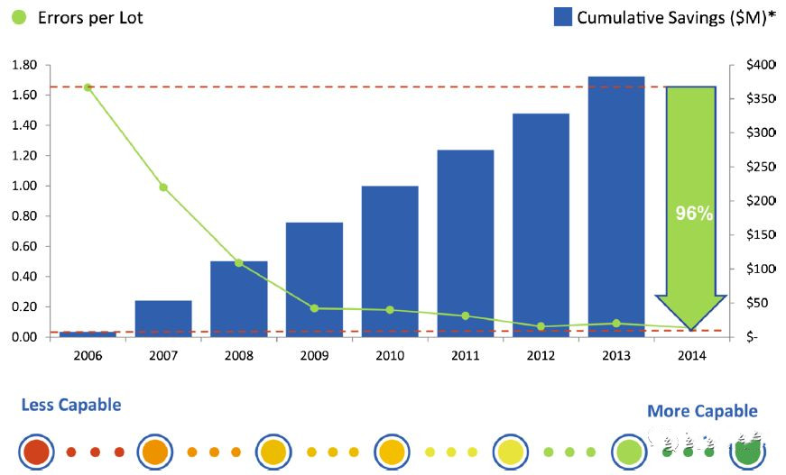 通过专注于将质量风险管理整合到质量管理体系和追求过程能力中,Lilly公司已经实现了改进,包括从2007年到2013年减少了50%的受伤率和40%的偏离率。