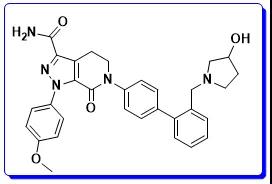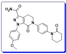 阿哌沙班是直接因子Xa(factor Xa, FXa)抑制剂,作为抗凝剂,用于降低非瓣膜性房颤患者中风和全身性栓塞的风险,也可用于预防深静脉血栓(deep venous thrombosis, DVT)的形成。阿哌沙班由辉瑞(Pfizer)与百时美施贵宝(Bristol-Myers Squibb,BMS)联合研发,于2011年5月18日获欧洲药物管理局(EMA)批准上市,之后于2012年12月28日获美国食品药品管理局(FDA)批准上市,于2012年12月25日获得日本医药品医疗器械综合机构(PMDA)批准上市,于2013年1月22日获得中国食品药品监督管理局(CFDA)批准上市。
