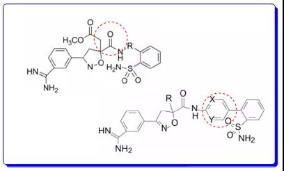 在当时,双芳脒结构为主流结构,通过将右侧四氢异喹啉丁酮酸片段换成苯脒,同时进一步考察化合物对凝血酶(越强越好)和胰蛋白酶(越弱越好)的作用,探究选择性活性。