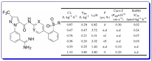 3-甲基取代的吡唑化合物,对FXa的抑制活性提高了1个数量级,3-三氟甲基取代的吡唑化合物,活性更强。多数化合物有较低的清除率分布容积和较长的半衰期,但口服生物利用度低于5%,未能达到口服给药的要求。分子结构中含有碱性较强的脒基(pKa为10.7),在体内分子带有正电荷,不易过膜吸收,因而口服吸收差。部分化合物PK/PD数据如下。