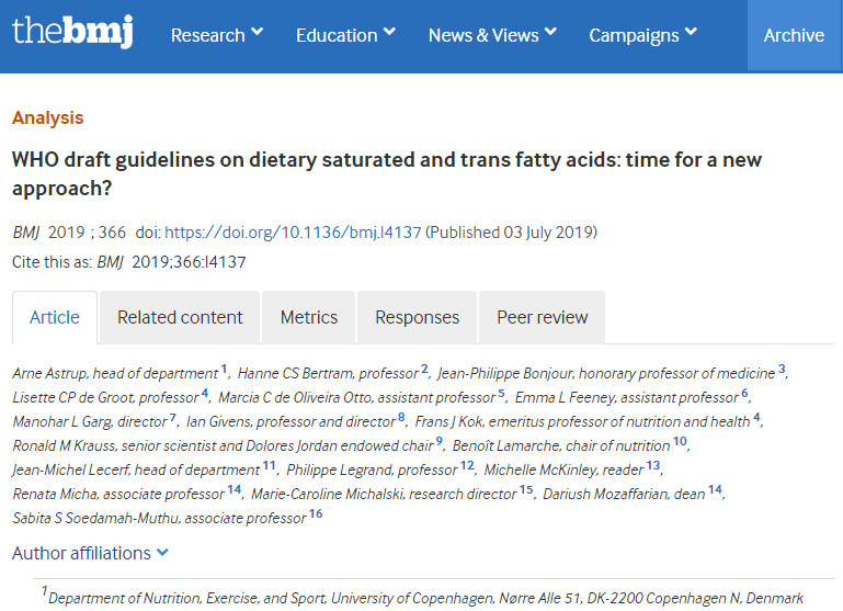 Arne Astrup等人在BMJ在线发表题为“WHO draft guidelines on dietary saturated and trans fatty acids: time for a new approach?”的分析论文,该文章指出世界卫生组织2018年关于膳食饱和脂肪酸和反式脂肪酸的准则草案建议减少饱和脂肪的总摄入量,并用多不饱和脂肪酸和单不饱和脂肪酸代替。
