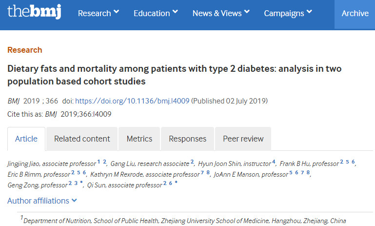 糖尿病患者心血管疾病预防和管理的现行膳食指南建议限制摄入饱和脂肪酸,反式脂肪和胆固醇,以及摄入更多的食物ω-3多不饱和脂肪酸(PUFA),如鱼,坚果等。但是,这些建议主要基于一般人群的调查结果。由于碳水化合物和脂肪的代谢改变,血脂异常和糖尿病患者的容易形成血栓,这些推荐是否可以外推荐给这些患者尚未得到阐明。2型糖尿病患者心血管疾病的风险是普通人群的2至3倍,因此需要澄清膳食脂肪,尤其是ω-3多不饱和脂肪酸对这些患者的健康影响。哈佛陈曾熙公共卫生学院孙齐及宗庚等人(浙江大学为第一单位)在BMJ 在线发表题为“Dietary fats and mortality among patients with type 2 diabetes: analysis in two population based cohort studies”的研究论文,该研究是前瞻性纵向队列研究,有11264名患有2型糖尿病的参与者,时间跨度达到34年,主要结果是随访期间的总体和心血管疾病死亡率。研究发现对于2型糖尿病患者,与碳水化合物或饱和脂肪酸相比,较高的多不饱和脂肪酸(PUFA)摄入量与较低的总死亡率和心血管疾病死亡率相关。这些研究结果强调了膳食脂肪质量在预防2型糖尿病成人心血管疾病和总死亡率方面的重要作用;