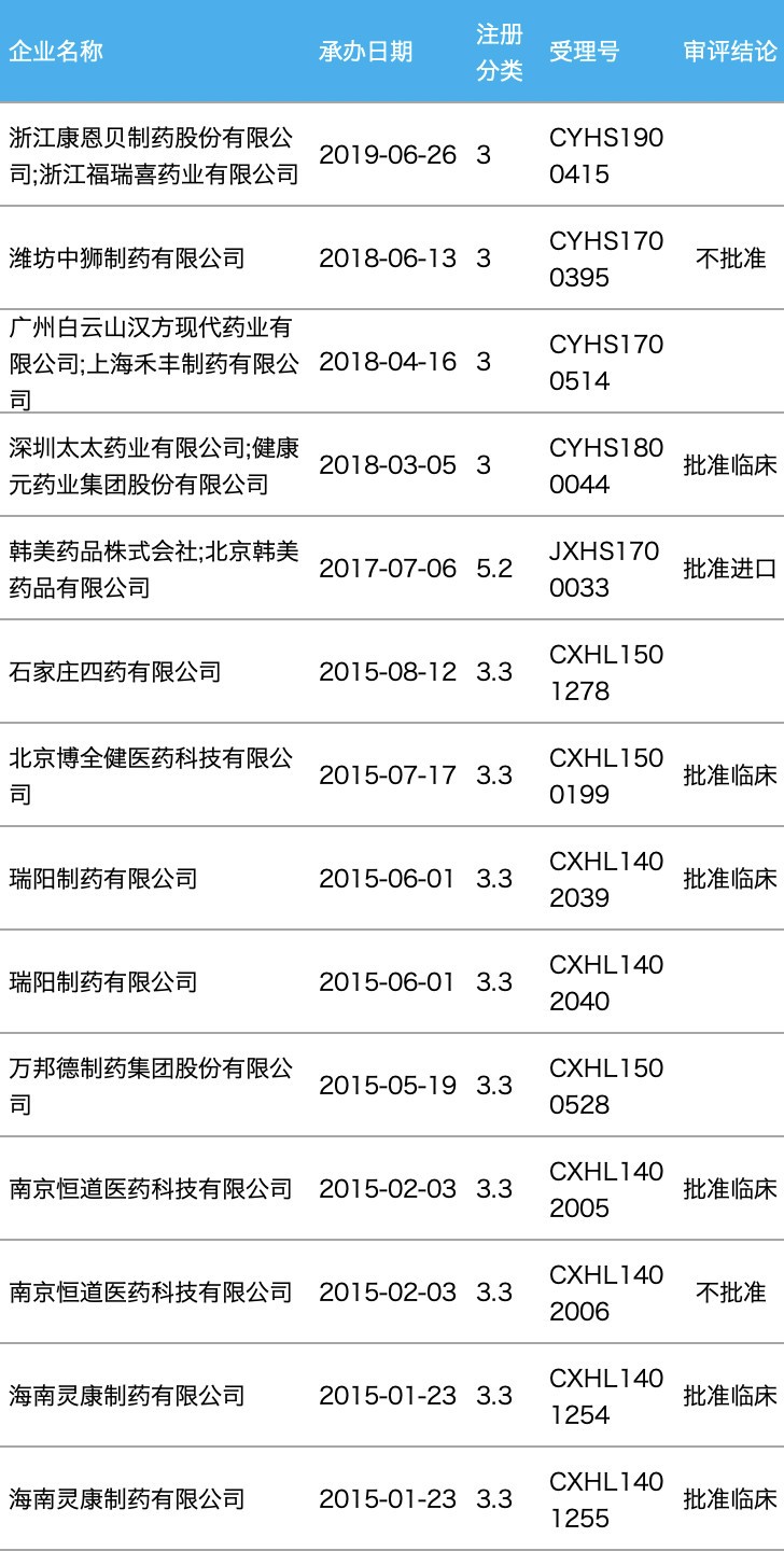 2019年6月,浙江康恩贝提交上市申请,因未见该企业的相关临床试验信息,该申请被直接批准上市的可能性较小。