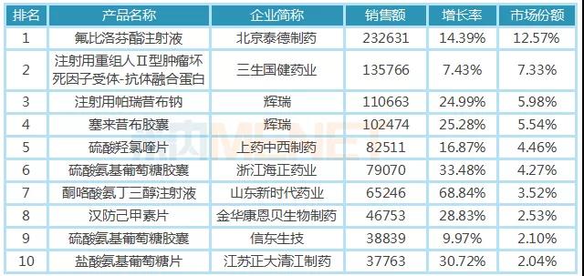 2018年中国公立医疗机构终端抗炎药和抗风湿药TOP10品牌中,除了辉瑞的注射用帕瑞昔布钠及塞来昔布胶囊外,其余8个均为国内药企品牌;10个品牌合占市场份额50.34%,北京泰德制药的氟比洛芬酯注射液遥遥领先。