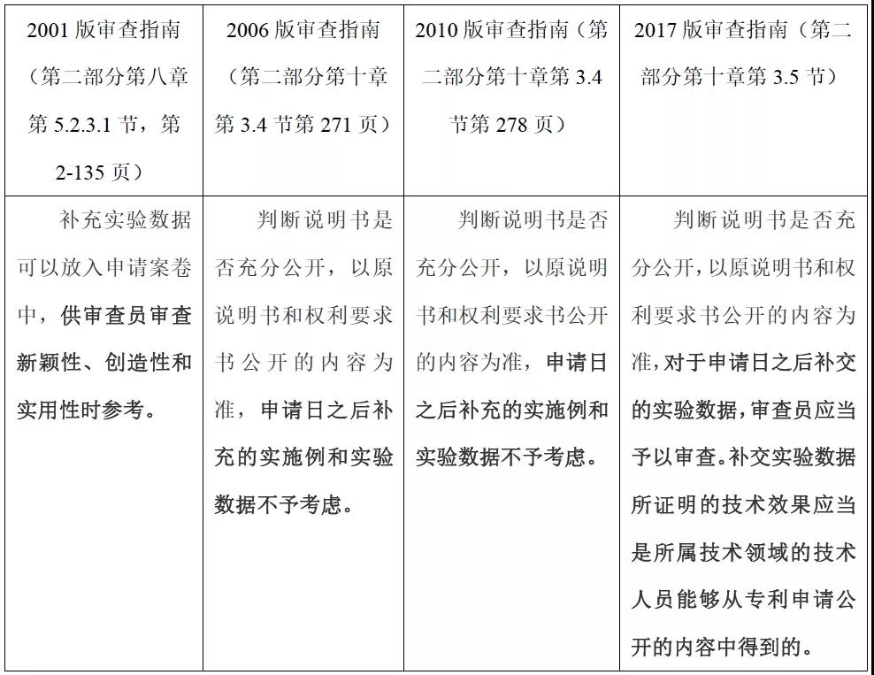 据此可知,在《审查指南》(2017)(见表3)的上述规定“对于申请日之后补交的实验数据,审查员应当予以审查。补交实验数据所证明的技术效果应当是所属技术领域的技术人员能够从专利申请公开的内容中得到的。”实施以后,会有越来越规范的规定,也会有更为正确地对待实验数据和补充试验数据的做法。