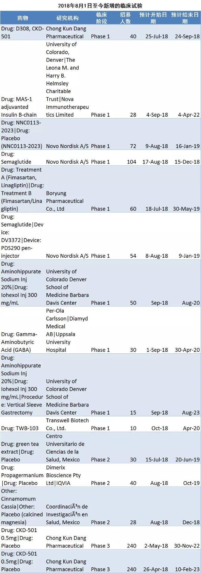 从2018年8月1日至23日,共有15个新发布的糖尿病新药临床试验。其中,处于1期的有10项,处于2期的有3项,处于3期的有2项。