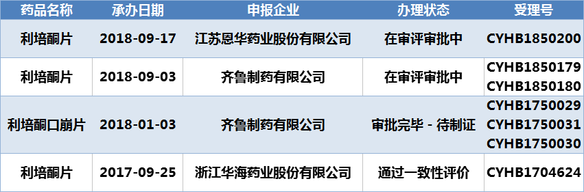 利培酮主要用于急性和慢性精神分裂症的治疗,国内已上市的剂型有片剂、口崩片、注射微球等。利培酮片由Janssen Pharmaceuticals Inc. (杨森)研发,于1992年在英国上市。国内主要生产厂家有浙江华海药业股份有限公司、江苏恩华药业股份有限公司、齐鲁制药有限公司等。