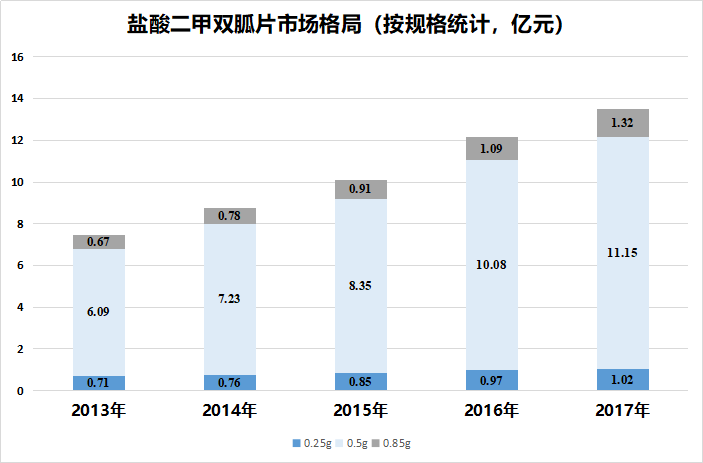 盐酸二甲双胍片是治疗糖尿病的基础用药,从盐酸二甲双胍片(不考虑其他胶囊、肠溶和缓释剂型)的市场格局来看,2017年0.25g的市场份额在1亿元左右,而0.5g和0.85g的市场份额要大的多,加起来超过12亿元,并且基本上全部由原研药格华止占据。