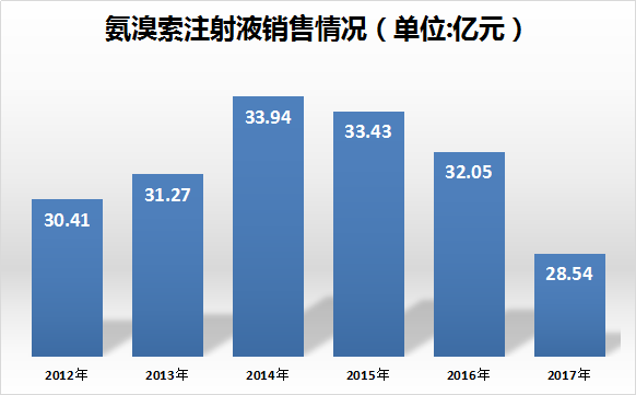 氨溴索原研由勃林格殷格翰公司开发,盐酸氨溴索注射液国产批文有53个。据重点城市公立医院数据,盐酸氨溴索注射液2017年销售6.11亿元,原研勃林格殷格翰占47.73%,常州四药占17.27%,沈阳新马药业11.13%。
