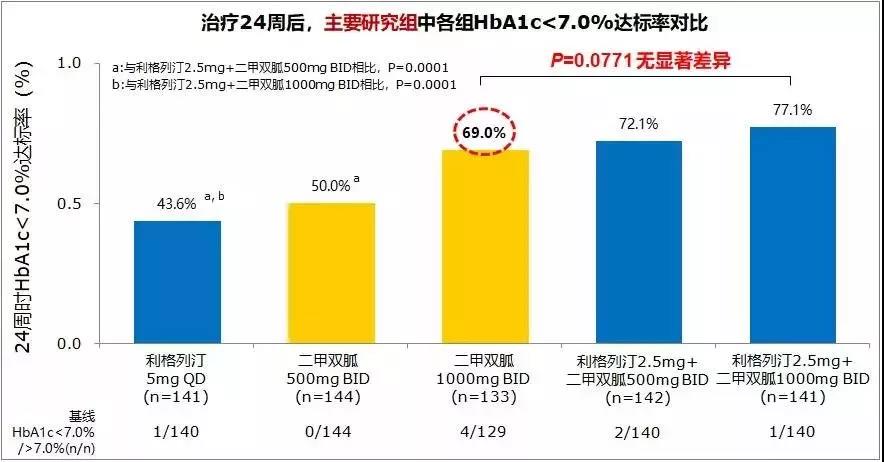 图2. 基线HbA1c接近9%的新诊断患者:二甲双胍单药2000 mg可使近70%的患者达标