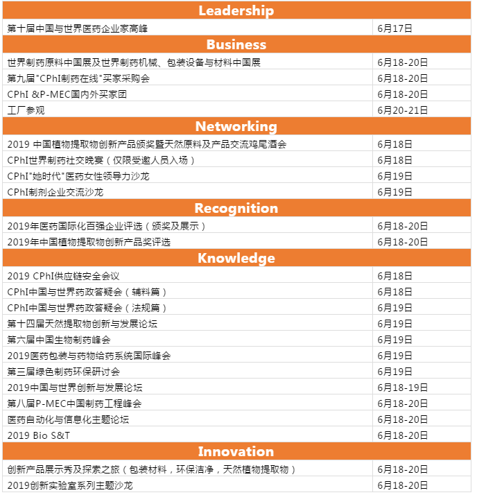 高端会议活动周 China Pharma Week三度启航 “China Pharma Week”作为CPhI China(世界制药原料中国展)同期特别推出的高端会议活动周,将于今年6月17-21日在申城三度启航,内容涵盖制药行业Leadership,Business,Networking,Recognition,Knowledge,Innovation 六大主题。会议内容覆盖面广,包含国内外医药法规新政解析、重点出口国家市场分析、海外市场开拓经验分享等;活动形式多样,从重量级的行业评选、企业高层交流晚宴,到创新产品展示秀、探索之旅等应有尽有。5天的时间,20余场会议活动,通过全方面、高水准、深层次、多角度的挖掘,使制药产业链各环节人士在优质的商业合作洽谈环境中收获高端社交人脉。