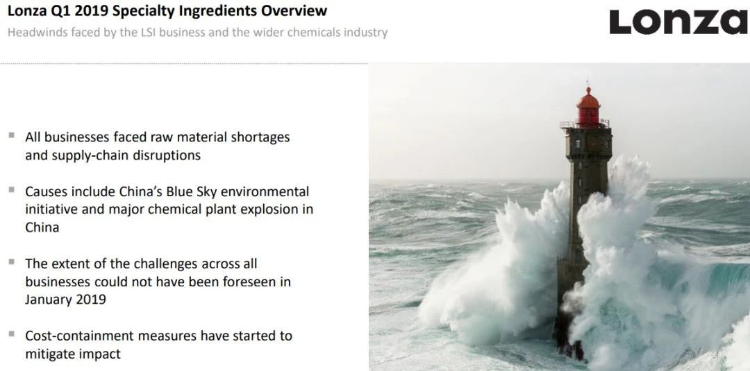 日前,全球最大的CDMO企业瑞士Lonza在2019年第一季度信息披露中表示:公司的特种化学品业务(Specialty Ingredients)告急。