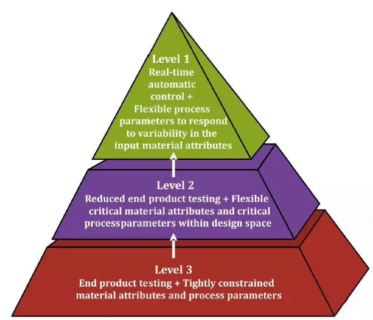 有三个层次的控制策略实施:1级—主动控制系统,实时监控过程变量和质量属性(依赖于主动过程控制系统); 2级—在确定的范围内操作(多变量)并通过最终测试或替代模型(依赖于过程监控和不合格材料的转移)进行确认; 3级—在不进行重要的最终产品测试的情况下,不可能在连续制造中解决自然变化的操作上可行。