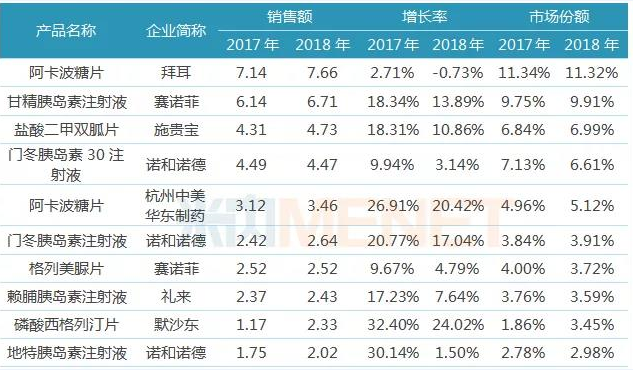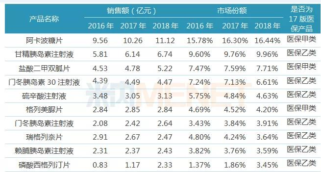 阿卡波糖片多年蝉联重点省市公立医院终端糖尿病化药TOP10榜首,2018年销售额为11.12亿元,同比去年增长8.4%,目前拥有阿卡波糖片生产批文的企业只有2家,为原研厂家拜耳及杭州中美华东制药。