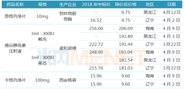 表1:原研药企主动申请降价的糖尿病用药(单位:元/片、支)