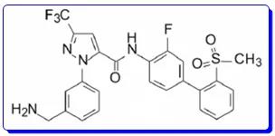 由于降低了分子的碱性,增加了过膜吸收性。在苄胺化合物中,吡唑环上有三氟甲基取代、联苯的近端苯环2位被氟取代、远端苯环4-甲磺酰基取代的化合物的口服生物利用度最佳、半衰期长达7.5 h,用家兔动静脉分流血栓形成模型测定的ID50 = 1.1 μmol·kg?1·h?1,IC50 = 0.15 μmol·L?1。给予这些活性数据和药代动力学性质,杜邦公司确定了候选化合物,编号为DPC-423,进入开发。