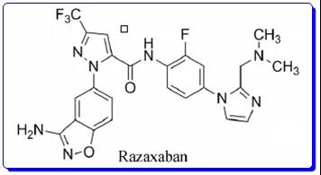 构效关系研究表明:DPC-423的甲磺酰基变换成氨磺酰基后,其活性未变,选择性提高了,但过膜性显著降低,系因增加了分子极性的缘故;远端苯环换成吡啶环,活性未变,过膜性仍较低;用咪唑、四氢吡咯或吗啉置换远端苯环,增加了助溶基团,提高了过膜性,但也因此与血浆蛋白的结合率>97%,也是活性降低的原因;为调整药代、维持活性强度和选择性,宜用1-(2-甲基咪唑)基取代;变换咪唑环上的取代基,羟甲基和氨甲基可能因极性强而降低活性;最终发现雷扎沙班(razaxaban),以盐酸盐形式进行临床研究,口服预防和治疗深度静脉栓塞疾病。