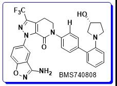 将雷扎沙班的氨基苯并异噁唑与杂环并合吡唑连接,合成了一类新的化合物,构效关系总结如下:(1)变换远端苯环上的叔胺基,二甲胺甲基和3-R-羟基四氢吡咯活性最强,体内抗凝作用也最强。(2)在近端苯环的邻位引入氟原子,比相应的化合物活性弱。(3)3-羟基四氢吡咯R构型活性比其S构型强3倍,体内抗凝活性也强于S构型。(4)吡唑环上的三氟甲基用甲基代替,活性降低。比格犬的药代动力学研究表明,以下化合物具有最好的性质,即BMS740808。