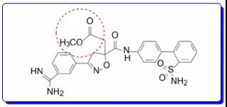 固定间位脒基、异噁唑环的乙酸甲酯基,考察中间的芳环对活性的影响;同时,由于结构中含有酯基,在体内会发生水解,在动物的血浆中有相当比例的游离酸存在,该游离酸对FXa的体内活性显著低于未水解的酯。