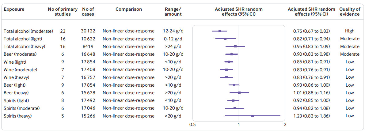 调整后的总体风险比:总酒精与酒精饮料之间的关联证据质量和2型糖尿病的发病率