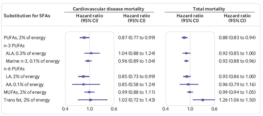 在随访期间,共记录了2502例死亡,包括646例因心血管疾病导致的死亡。多变量调整后,与总碳水化合物相比,摄入多不饱和脂肪酸(PUFA)与较低的心血管疾病死亡率相关;对于总PUFA,n-3 PUFA和亚油酸的摄入量也观察到与总死亡率的反向关联,动物而非植物来源的单不饱和脂肪酸与更高的总死亡率相关。