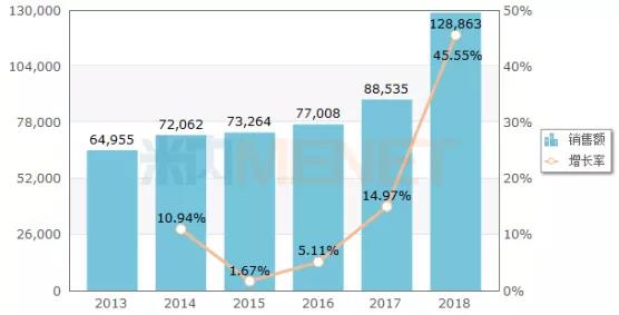 图1:2013-2018年中国公立医疗机构终端注射用帕瑞昔布钠销售情况(单位:万元)