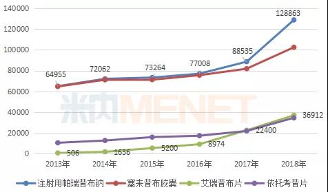 艾瑞昔布片是由国内药企恒瑞医药自主研发的1类新药,于2011年6月获得国家药监局批准上市。作为国内首家昔布类药物自主品牌,再加上恒瑞庞大的营销网络,艾瑞昔布近几年在中国公立医疗机构终端的销售额增长迅速,未来前景可期。