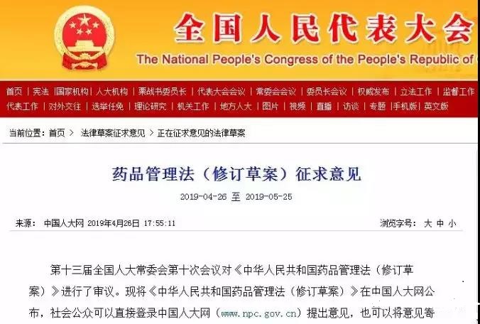 2019年4月26日,第十三届全国人大常委会第十次会议对《中华人民共和国药品管理法(修订草案)》进行了审议。中国人大网公布了《中华人民共和国药品管理法(修订草案)》,社会公众可以直接登录中国人大网(www.npc.gov.cn)提出意见,也可以将意见寄送全国人大常委会法制工作委员会(北京市西城区前门西大街1号,邮编:100805。信封上请注明药品管理法修订草案征求意见)。征求意见截止日期:2019年5月25日。