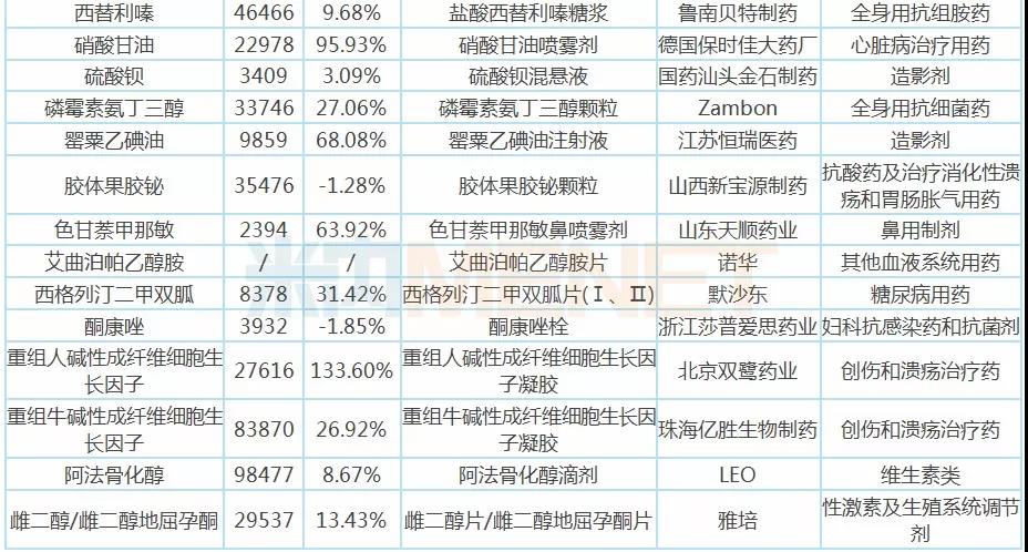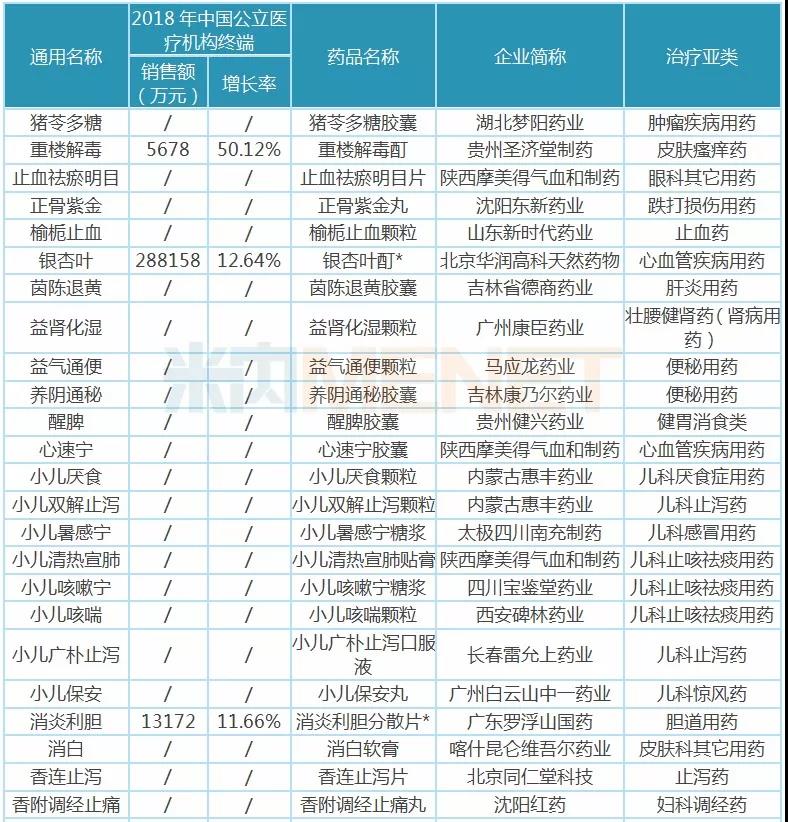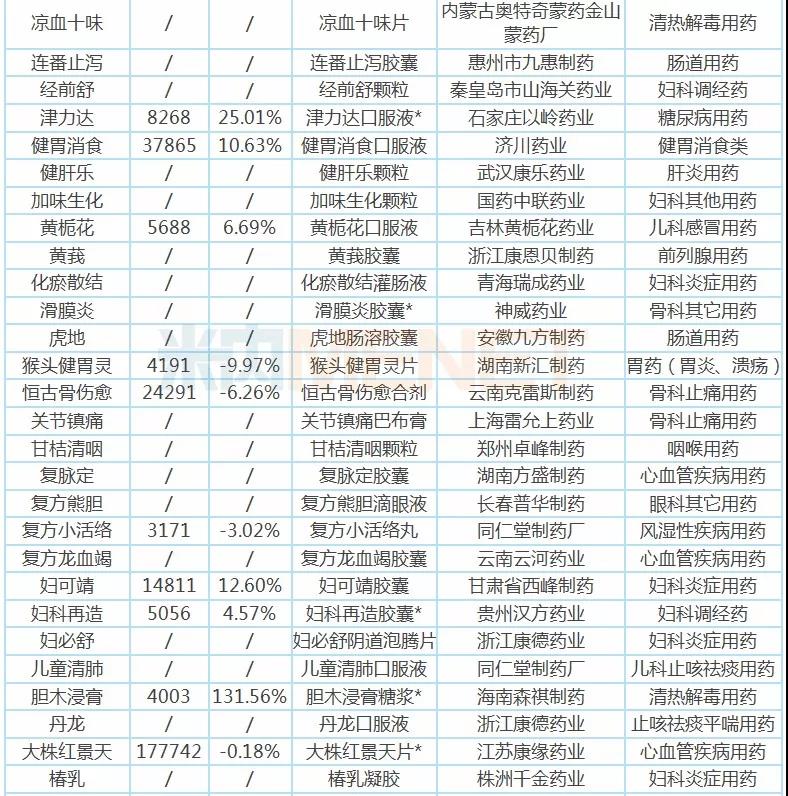 北京同仁堂新增的独家中成药有香连止泻片、复方小活络丸、儿童清肺口服液、八味锡类散;远大健康的有小儿咳喘颗粒(西安碑林药业)、小儿广朴止泻口服液(长春雷允上药业)、灵宝护心丹(雷允上药业);摩美得制药的有止血祛瘀明目片、心速宁胶囊、小儿清热宣肺贴膏;康恩贝的有龙金通淋胶囊(云南希陶绿色药业)、黄莪胶囊(浙江康恩贝制药)、肠炎宁片(江西康恩贝中药)。