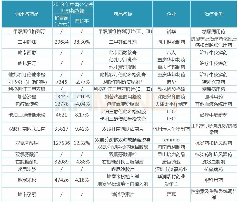 新版医保目录新增化学药中,有58个(细分到剂型)为独家品种,从药物治疗亚类看,糖尿病用药、抗高血压药等慢性用药占较大比例。58个独家化药在2018年中国公立医疗机构终端合计销售额(以通用名计)超过120亿元。