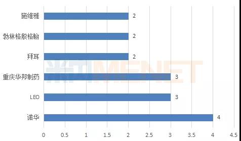 医保新增58个独家化学药共涉及48家企业,跨国药业与国内药企所占品种数不分伯仲,但从单个企业拥有的品种数看,超过2个品种的企业中仅1家为国内药企。诺华以4个新增独家化学药领先,LEO、重庆华邦制药以3个品种数紧接其后。