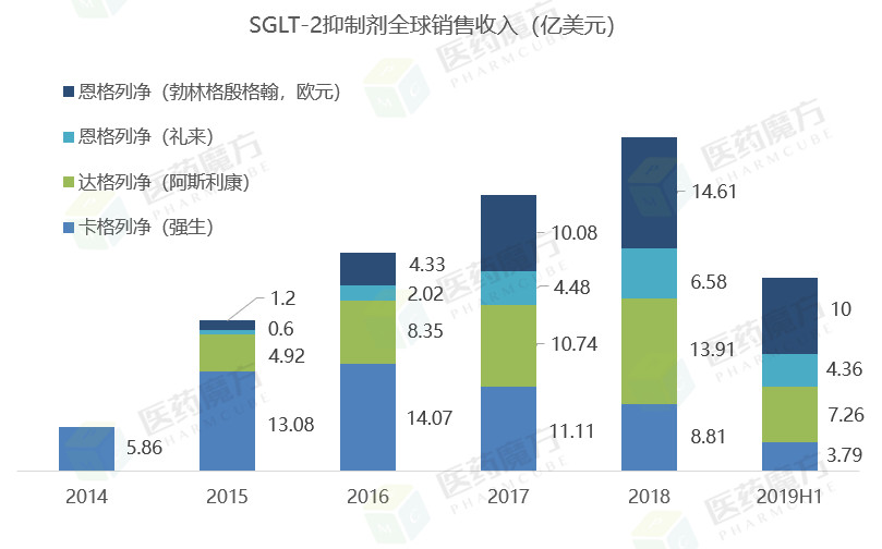 达格列净是一种钠-葡萄糖协同转运蛋白-2(SGLT-2)抑制剂。SGLT-2主要在肾脏表达,主要作用是帮助肾脏对葡萄糖的重吸收。SGLT-2抑制剂主要通过抑制SGLT-2的活动来减少肾脏对葡萄糖的重吸收,促进多余的葡萄糖通过尿液排出,进而发挥降糖作用。SGLT-2抑制剂是非胰岛素依赖性的降糖药,是糖尿病治疗的新途径。SGLT-2抑制剂这种降糖药用于治疗心衰的作用机制尚未完全阐明。截至目前,全球目前共批准上市了8款SGLT-2抑制剂类药物,其中托格列净、鲁格列净、伊格列净仅在日本获批。统计3个最受关注的SGLT-2抑制剂(默沙东埃格列净销售额未披露)可发现,SGLT-2抑制剂药物的市场规模在2018年已经超过40亿美元,2019年更是可能超过50亿美元。