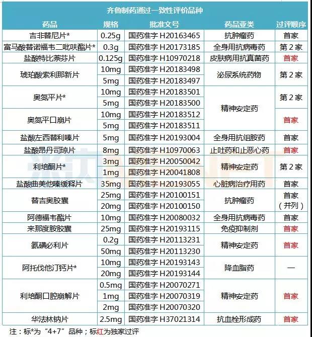 齐鲁制药通过一致性评价的品种情况