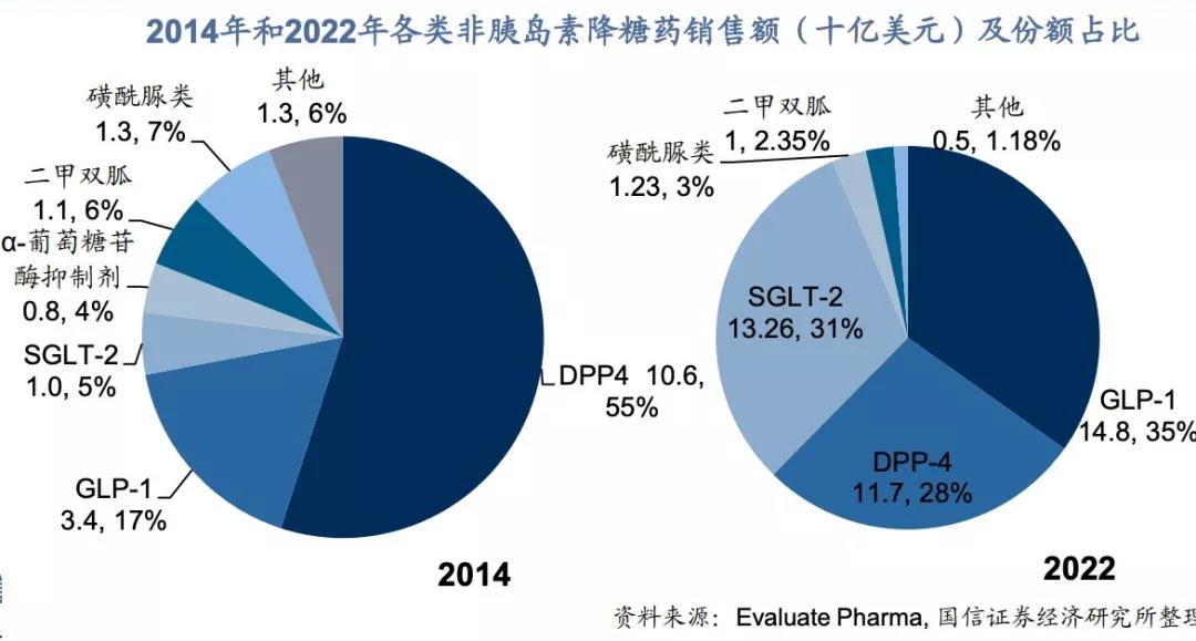 根据Evaluate Pharma的预测,SGLT-2抑制剂将在2022年超过DPP-4i,成为第一大口服降糖药,销售额达到130亿美元。