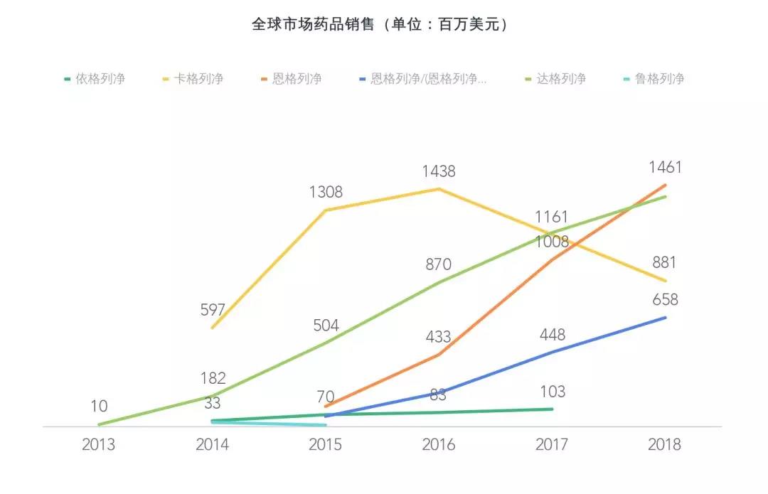 根据全球制药公司年报披露数据显示,2018年恩格列净销售额已超过达格列净和卡格列净,达到14.6亿美元。同时礼来的恩格列净+利格列汀复方制剂,销售额也快速增长,稳固了礼来在这个领域的霸主地位。